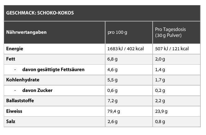 - 79,4g Eiweiss pro 100g (Schoko-Kokos)