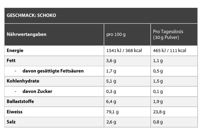 - 79,1g Eiweiss pro 100g (Schoko)